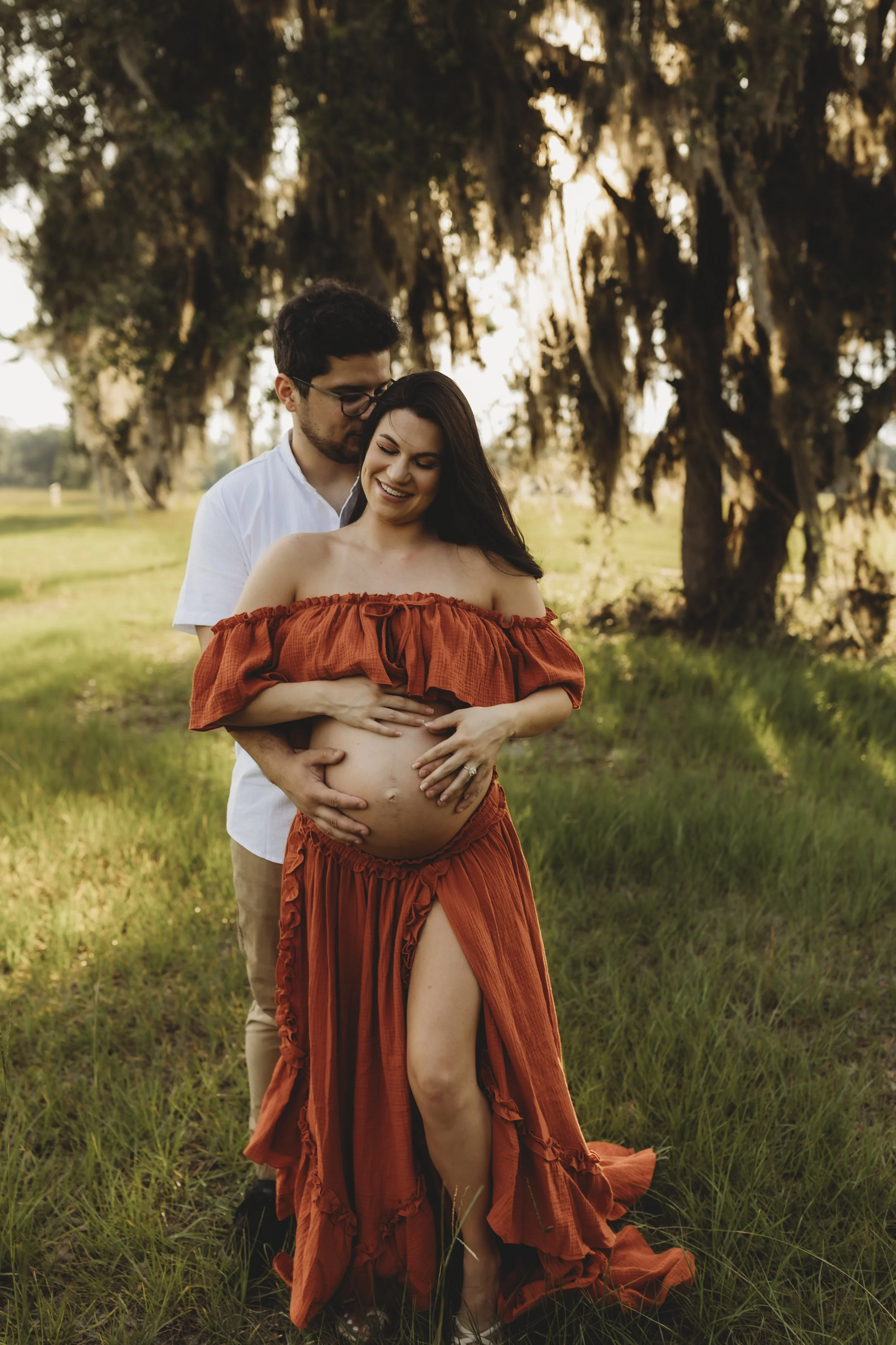 This off-the-shoulder gown features a soft, flowing silhouette with a gently ruffled neckline and a lightweight skirt that moves beautifully with every step. Designed to be worn either over or under the belly, it offers versatile styling for maternity clients at any stage, while also flattering non-maternity figures. The elastic bodice provides comfort and flexibility, creating an effortlessly feminine shape whether styled to highlight the bump or drape softly beneath it.